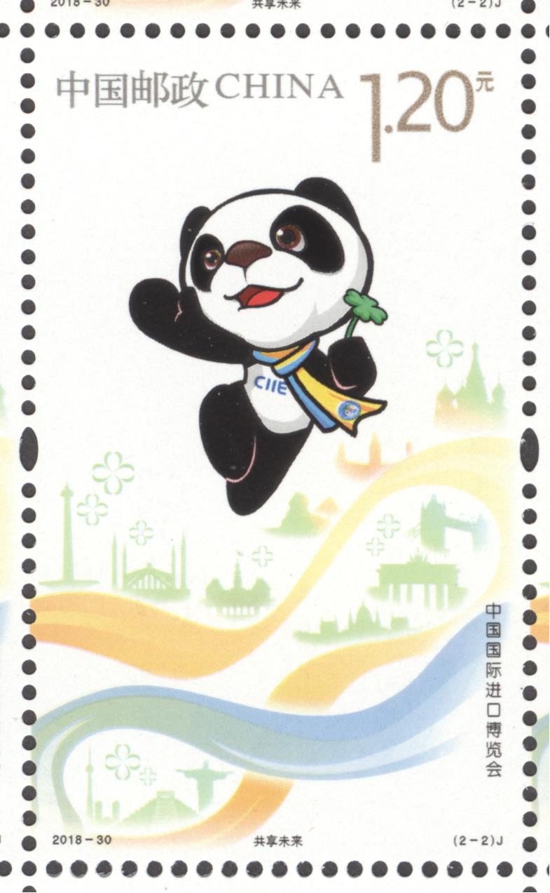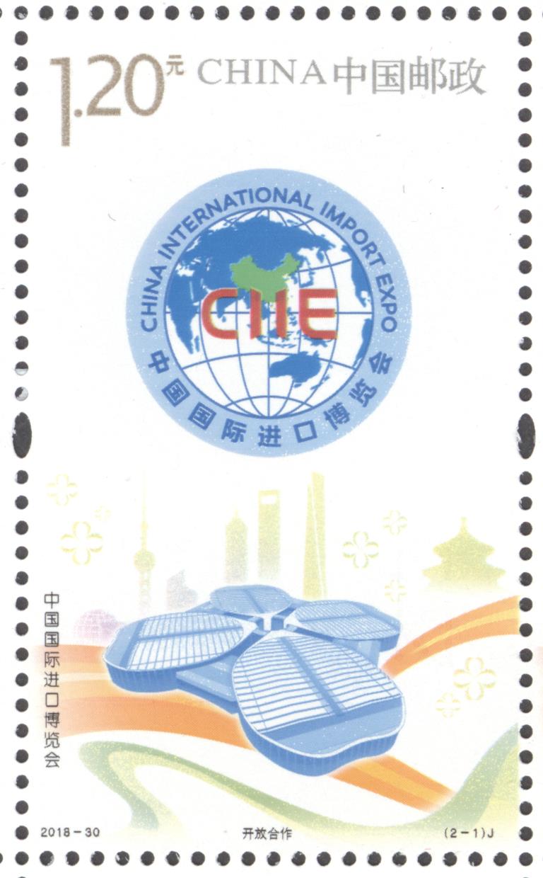 中国邮政定于2018年11月5日发行《中国国际进口博览会》纪念邮票1套2枚,邮票图案名称分别为:开放合作、共享未来,全套邮票面值为2.40元。