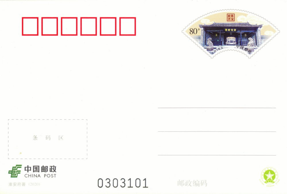 中国邮政定于2020年9月26日发行《淮安府署》普通邮资明信片1套1枚。详情如下: