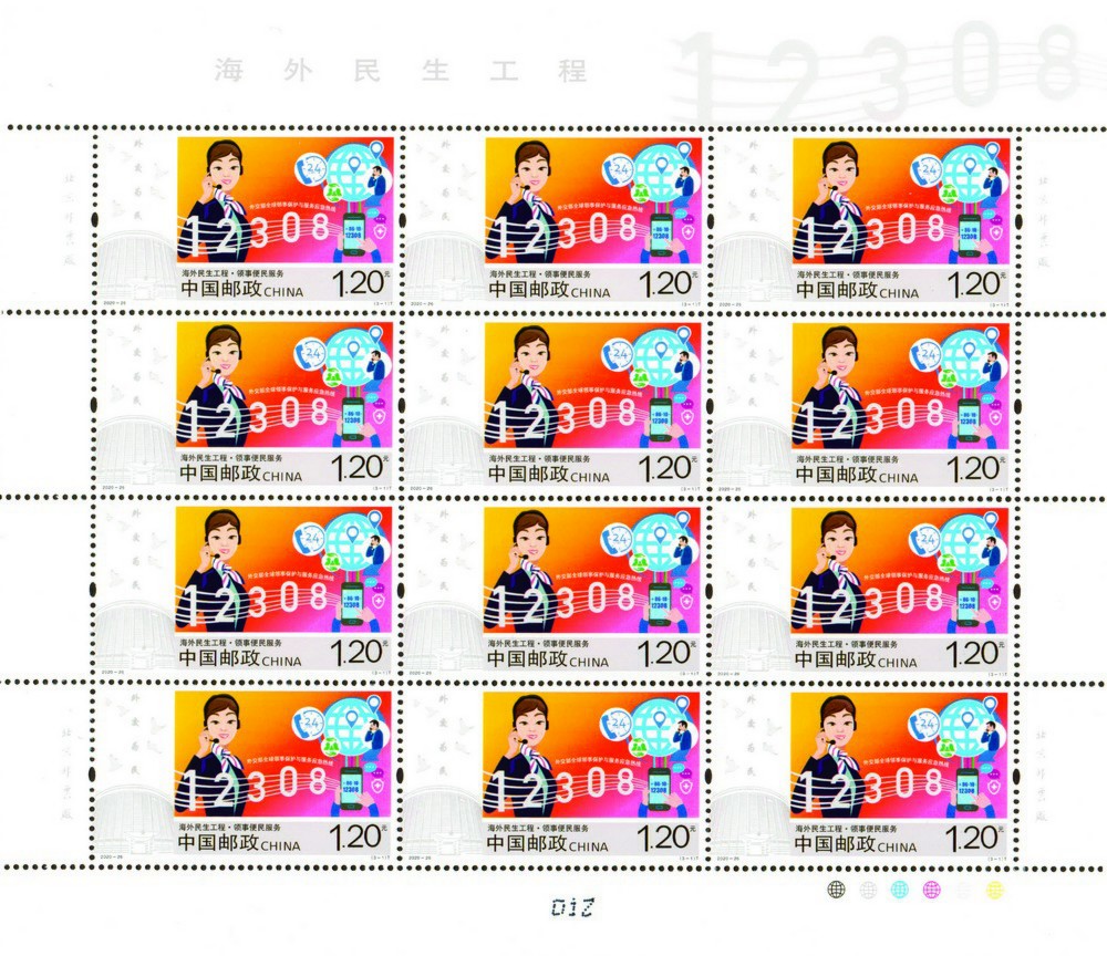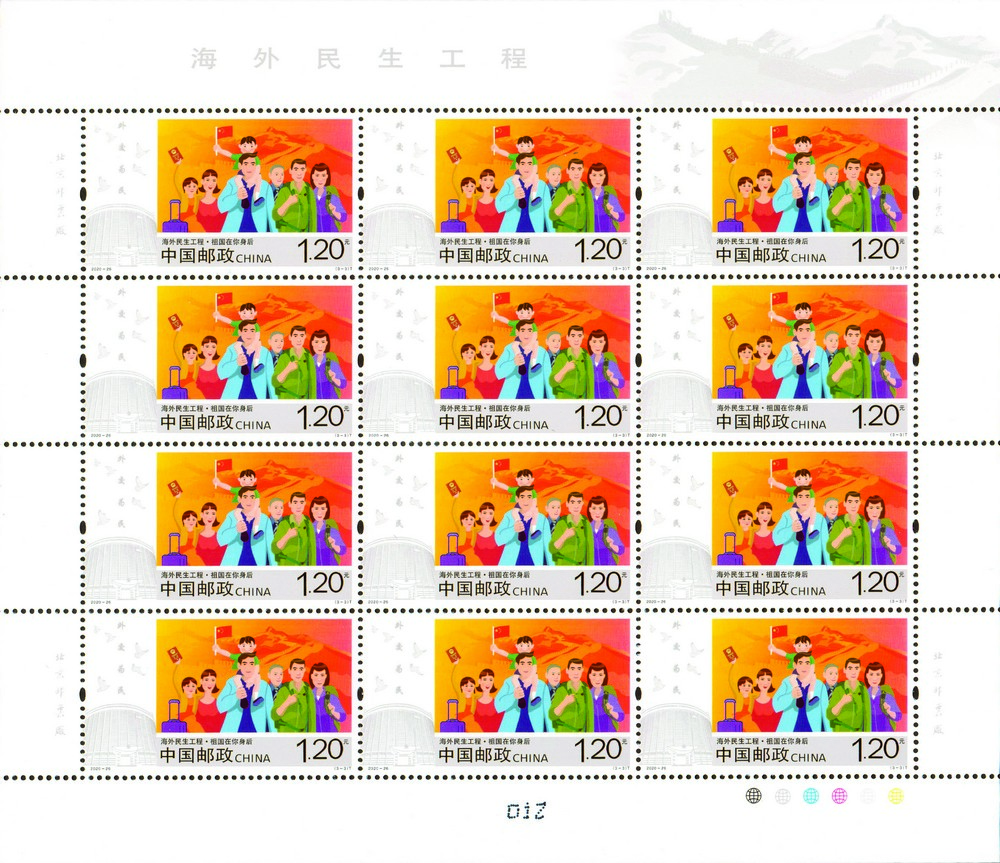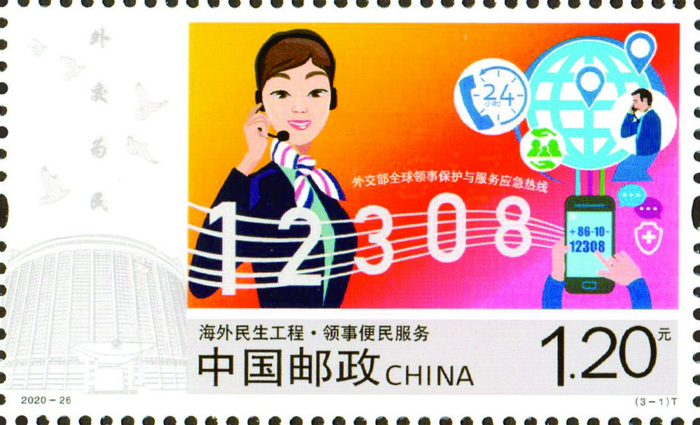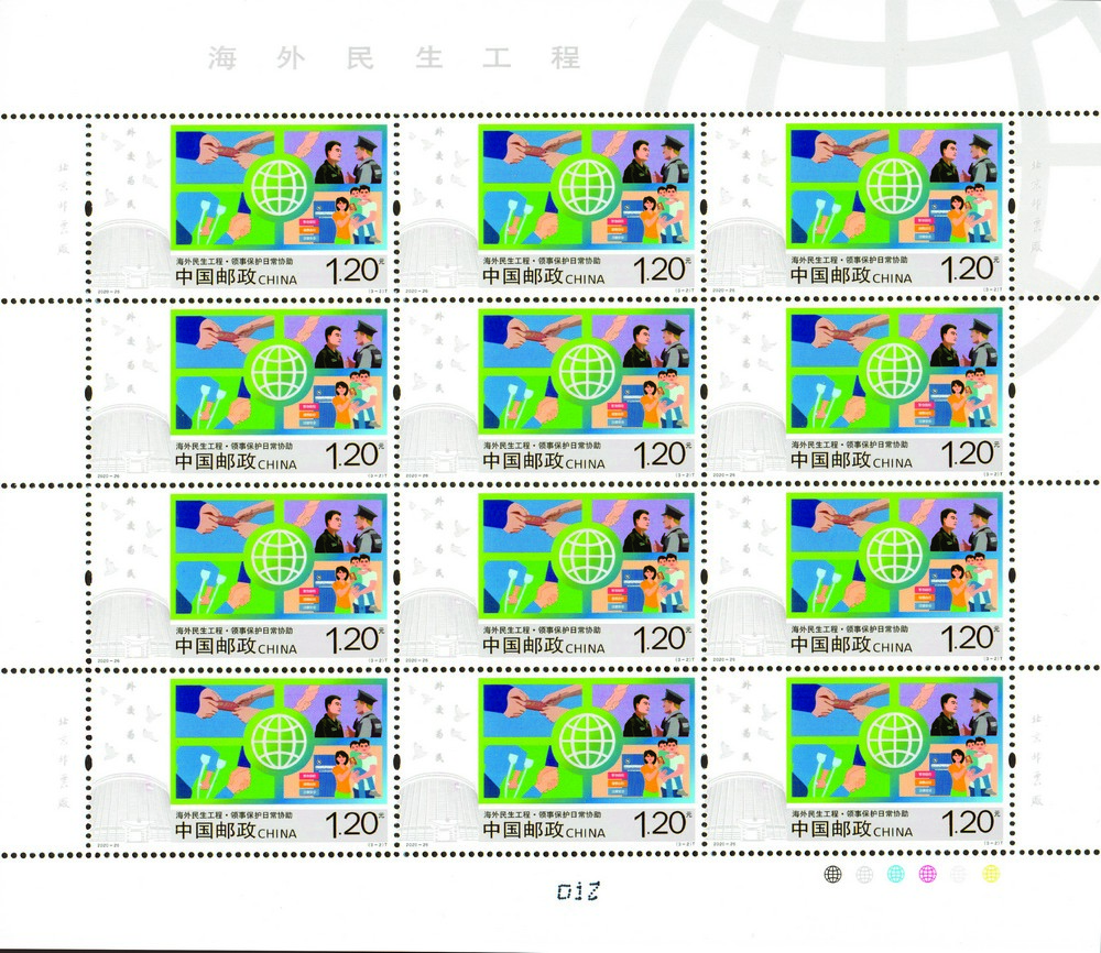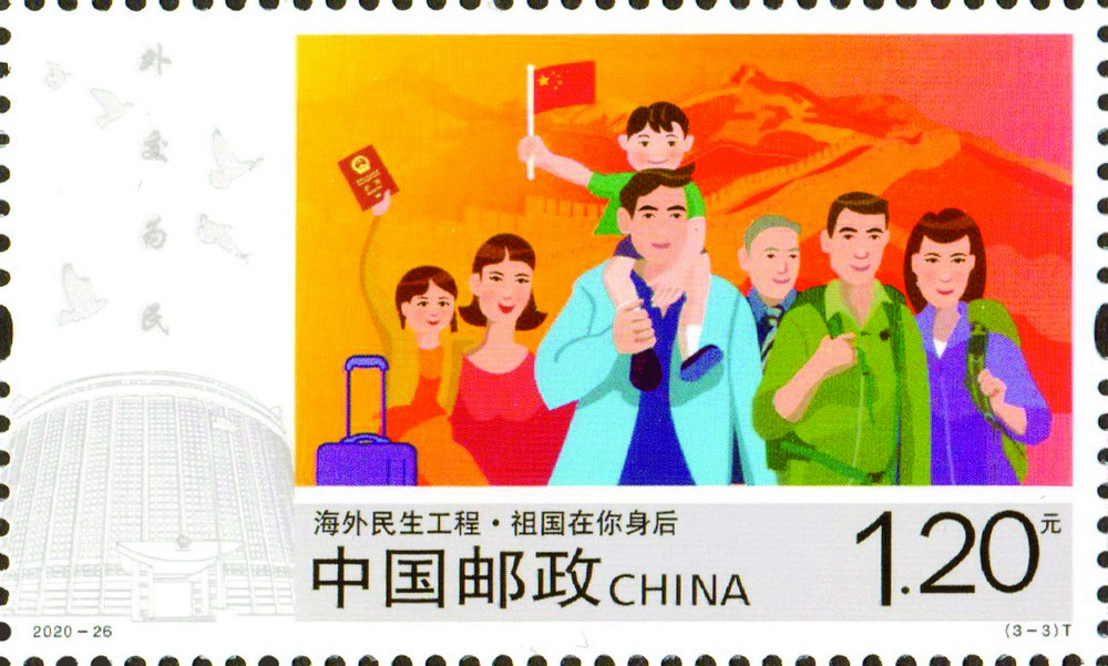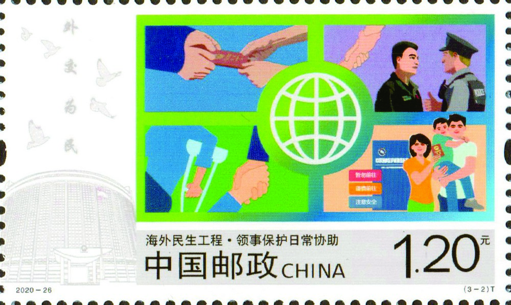 中国邮政定于2020年11月12日发行《海外民生工程》特种邮票一套3枚。邮票图案名称分别为:领事便民服务、领事保护日常协助、祖国在你身后。全套邮票面值为3.60元。计划发行数量为760万套。